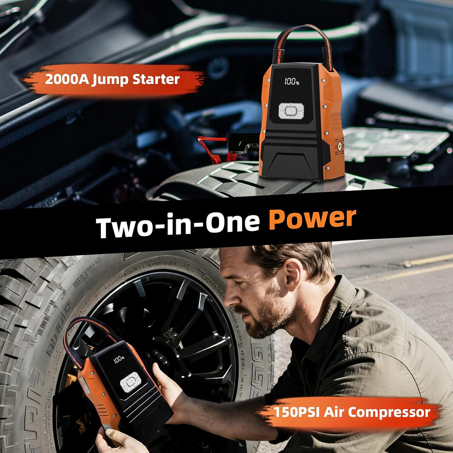 | Included Components | 1* jump starter with air compressor,1* smart jumper cables,1* air pump hose,3* gas nozzles, 1*Car charging cable, 1* user manual, 1* portable carrying case, 1* velvet bag |